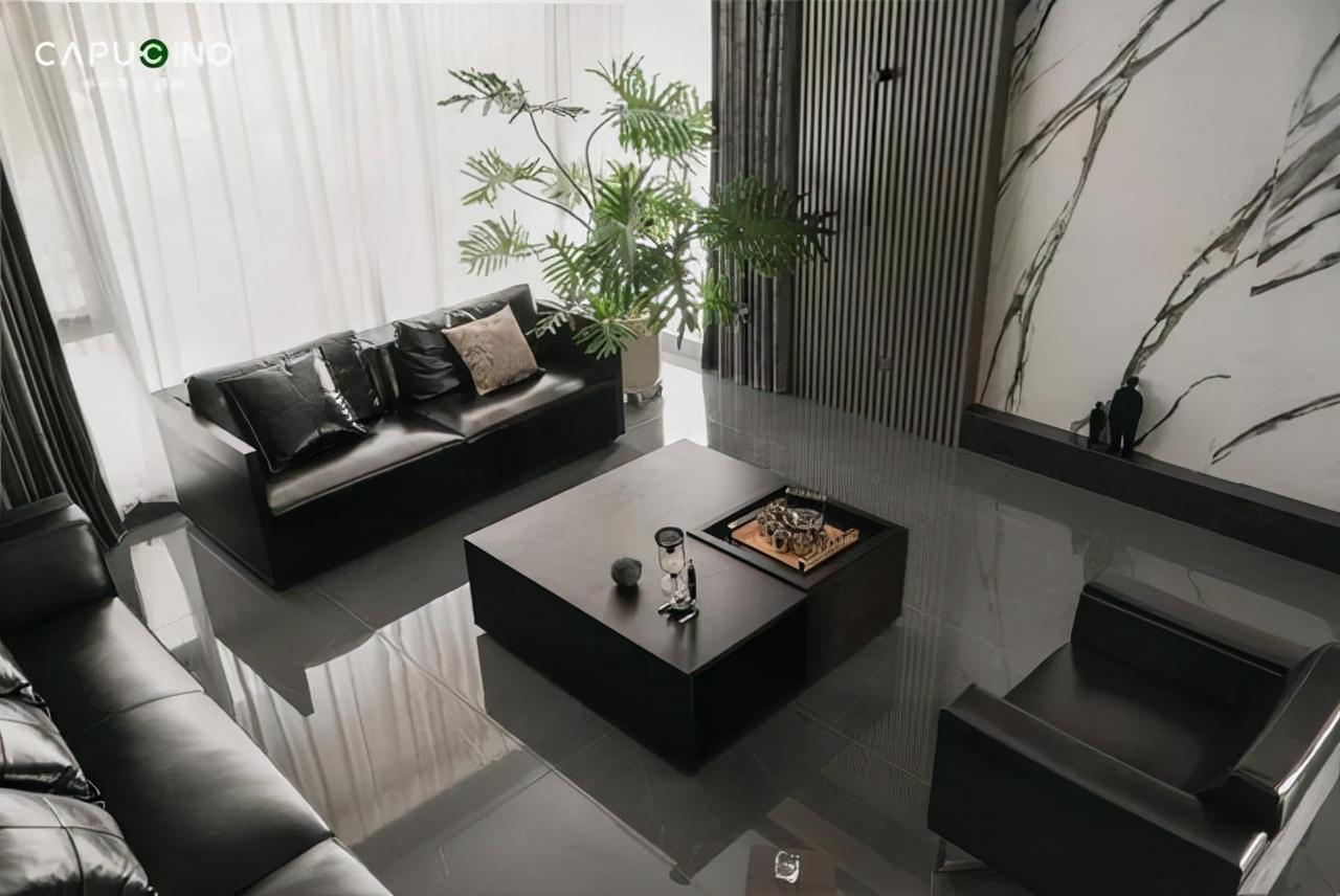 客厅中优雅的灰黑色空间贯穿全场,天然的木质、独特纹理、皮质沙发、自然绿植、精致装置,和谐统一的配色高级又耐看,满满的高级感。