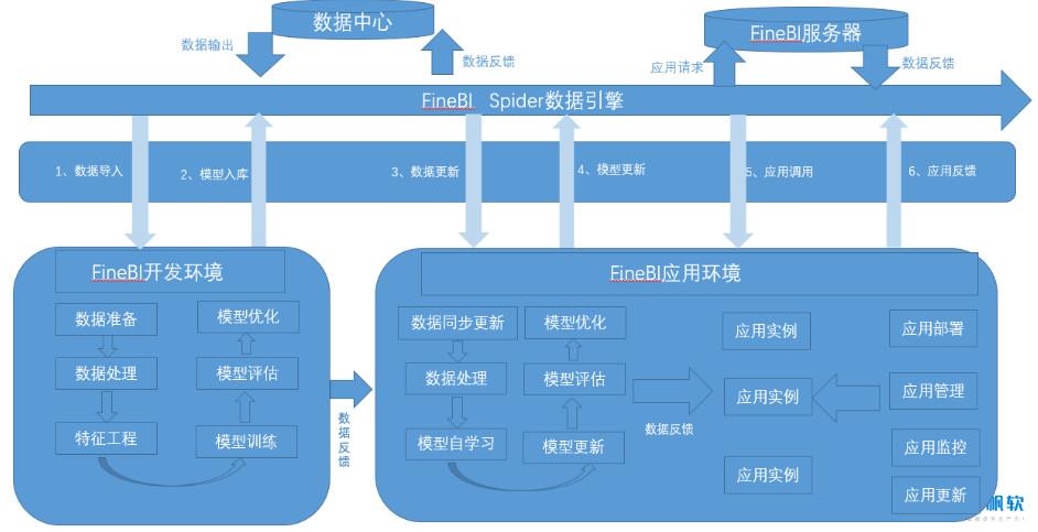 如上图,是帆软数据挖掘项目架构图,主要分为模型开发与模型应用两个环节,模型开发包括数据准备、数据处理、特征工程构建、模型训练、模型评估、模型优化等,模型应用包括数据更新、模型自动更新、模型应用、应用管理等。