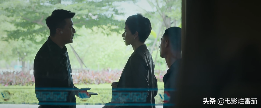 即便听不到台词,但看着人影在窗外的站位和气场,就知道万茜在两名手下中的地位。
