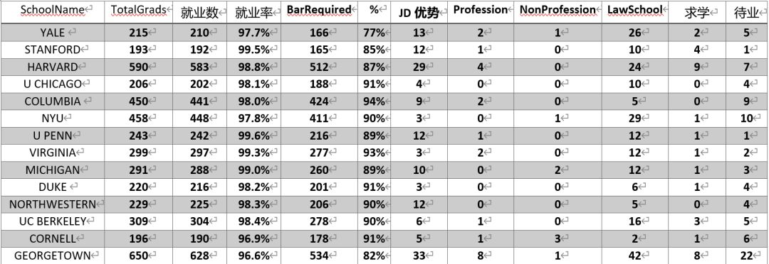 小编为大家精心整理了ABA最新公布的2019年美国法学院学生就业数据。我们将分为两篇,今天为大家解析2019年美国顶级法学院毕业生的就业数据,主要关注整体就业情况和职位特点。下期将剖析就业行业数据和就业地点信息。我们所有的数据都源于ABA官方公布的509披露数据,权威可靠,请大家放心食用~~~
