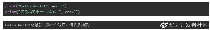 可以看到,每条print()语句,都会占一行。如果想将上面的三句话输出到同一行,可以这样: