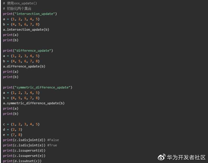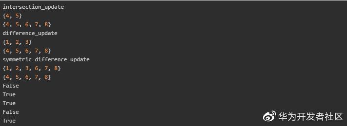 symmetric_difference_update()/ intersection_update()/ difference_update()/update():还是进行前面的对应交、并、差、对称差操作,但将运算的结果,更新到这个集合。 isdisjoint():a.isdisjoint(b),a和b两个集合是否没有交集,没有交集返回True issubset():a.issubset(b),a是否为b的子集,是返回True issuperset():a.issuperset(b),a是否为包含b的所有元素,包含返回True