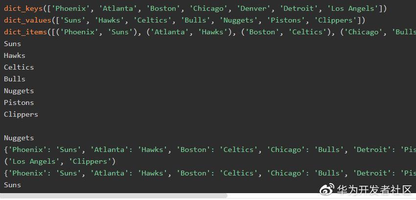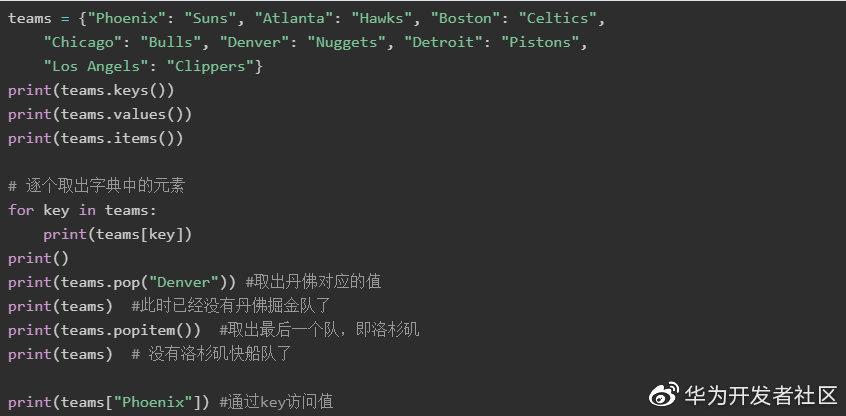 items():以列表返回可遍历的(键, 值) 元组数组keys():返回一个包含所有键的可迭代对象,可以使用 list() 来转换为列表values():返回一个包含所有值的可迭代对象,可以使用 list() 来转换为列表pop(key[,default]):取出对应key的值,如果不存在,则使用default值popitem():取出字典中最后一个key-value对get(key[,default]):取出对应key的值,如果不存在这个key,则使用default值