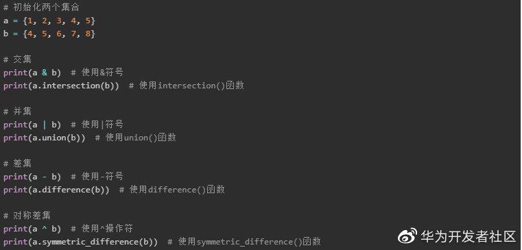 对称差集( symmetric difference):两个集合生成新的集合,新集合中的元素是两个集合的元素减去两者一样的元素。可以使用^操作符或者symmetric_difference()函数进行对称差集操作