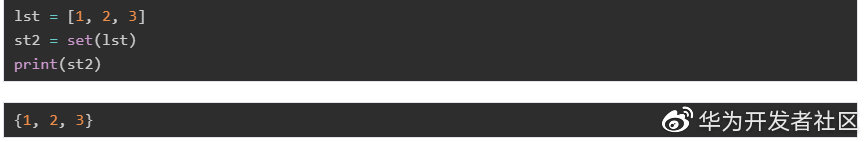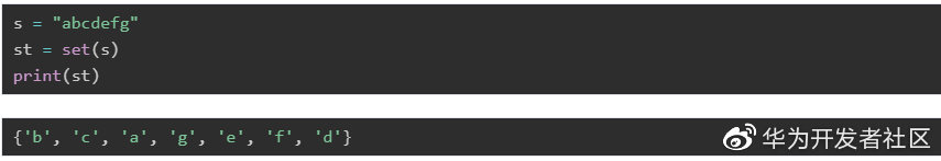如果使用{}创建集合,要注意和字典数据类型的区别——字典数据里是key-value对,而这里是单个的数据如果创建空集合,不可以使用{},因为系统会首先将其当做字典数据类型来处理。所以空集合请使用set()来创建如果往集合中放入重复元素,将只会保留一个。从字符串创建一个集合: