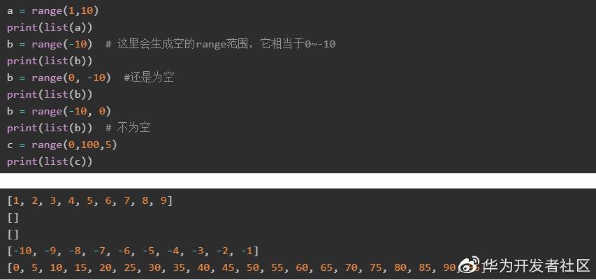 range(stop) :0开始计数,计数到stop结束,但不包括stop,例如:range(10),生成的数字范围是0-9range(start, stop[, step]):计数从 start 开始,到stop结束(不包括stop),step是步长,即每次变化的范围,默认为1,即每次加1start/stop/step均可以为任意整数“start < stop”,才能生成包含元素的range,如果stop< start,则为空。