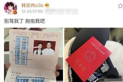 12月23日,曾参加过《变形计》的城市女孩韩安冉晒出了一张离婚证,并配文“别骂我了,抱抱我吧”,之后又删除了这条微博。从2019年6月举办婚礼到12月23号宣布离婚,韩安冉这段仅6个月的婚姻,彻底画上了句号。