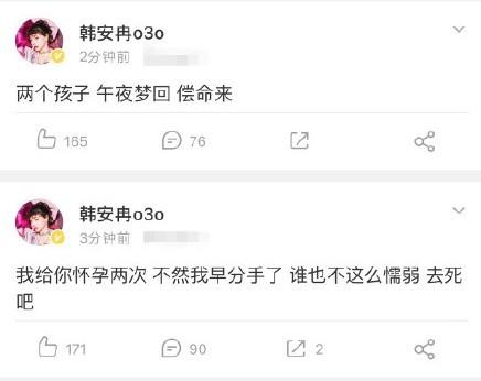在结婚前,韩安冉就经常和前夫小猪在网上撕,两人恋爱期间,韩安冉为了男方流过两次产,并自曝因为男方不负责任,不要孩子,自己在怀孕期间吹笑气(一种新型毒品)。