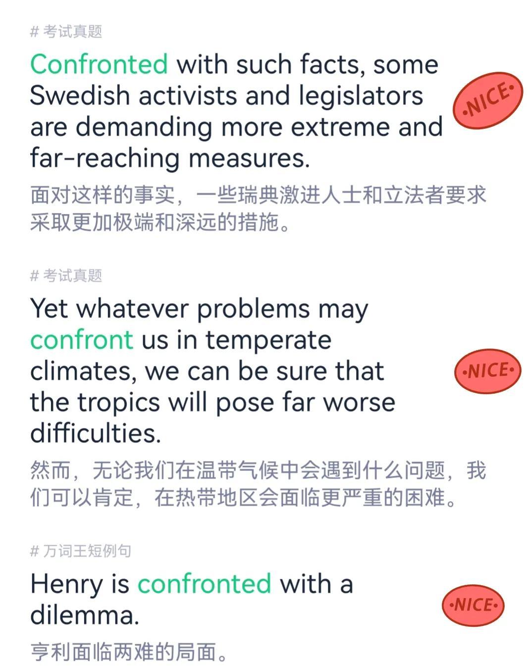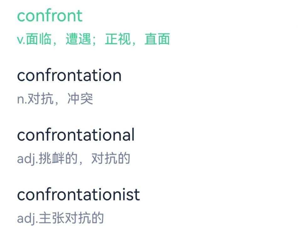 confront动词,面临;直面 confrontation名词,对抗,冲突confrontational形容词,对抗的confrontationist形容词,主张对抗的