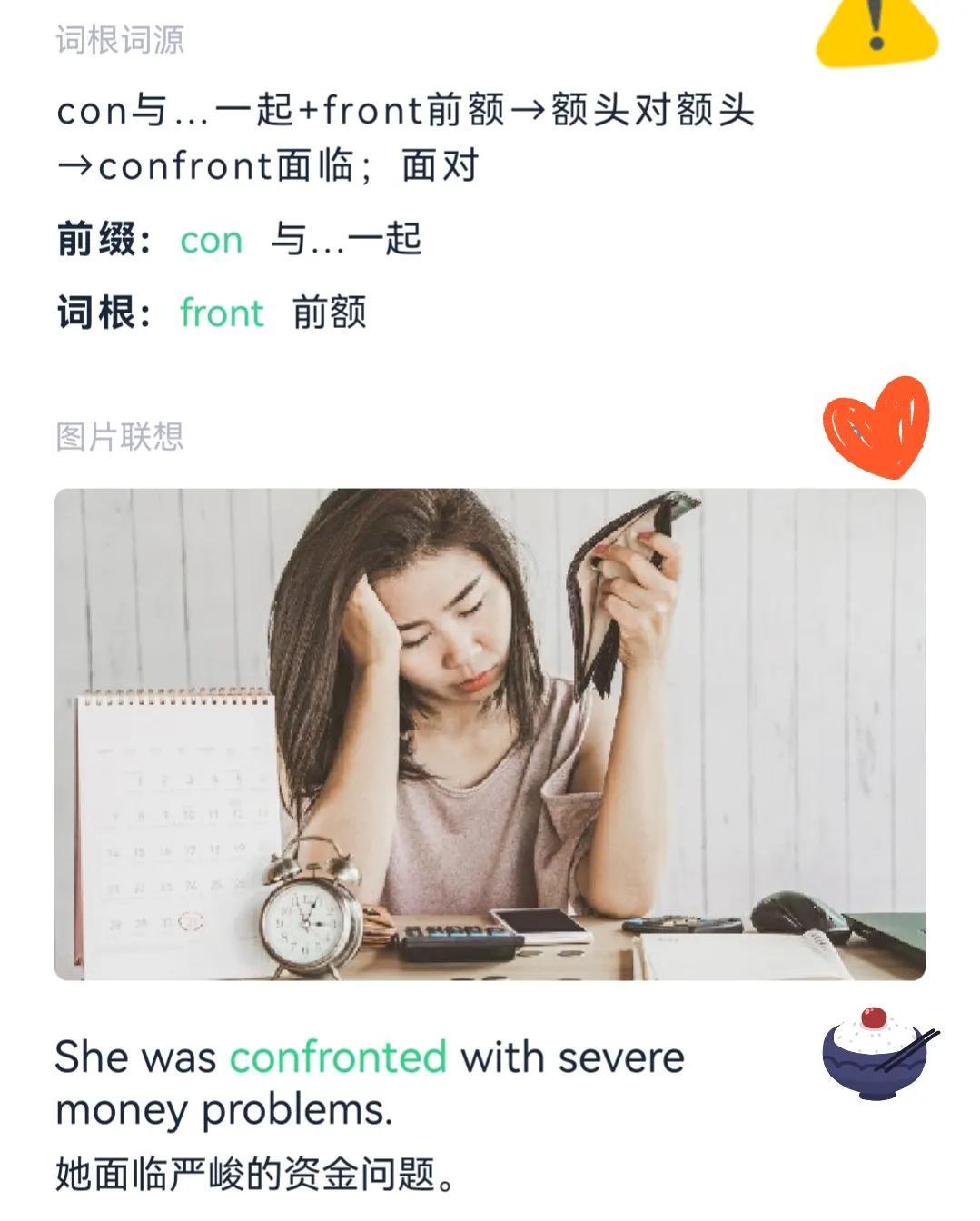 词根词源:con与…一起+front前额→额头对额头→confront面临,面对