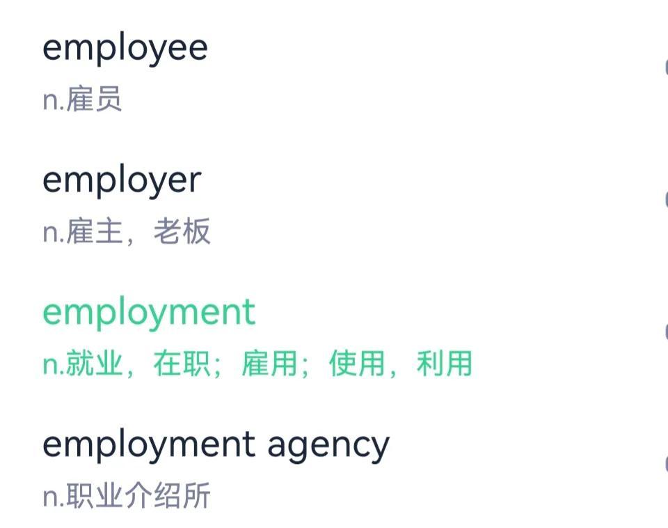 employer名词,雇主— employment名词,就业;雇用employment agency名词,职业介绍所