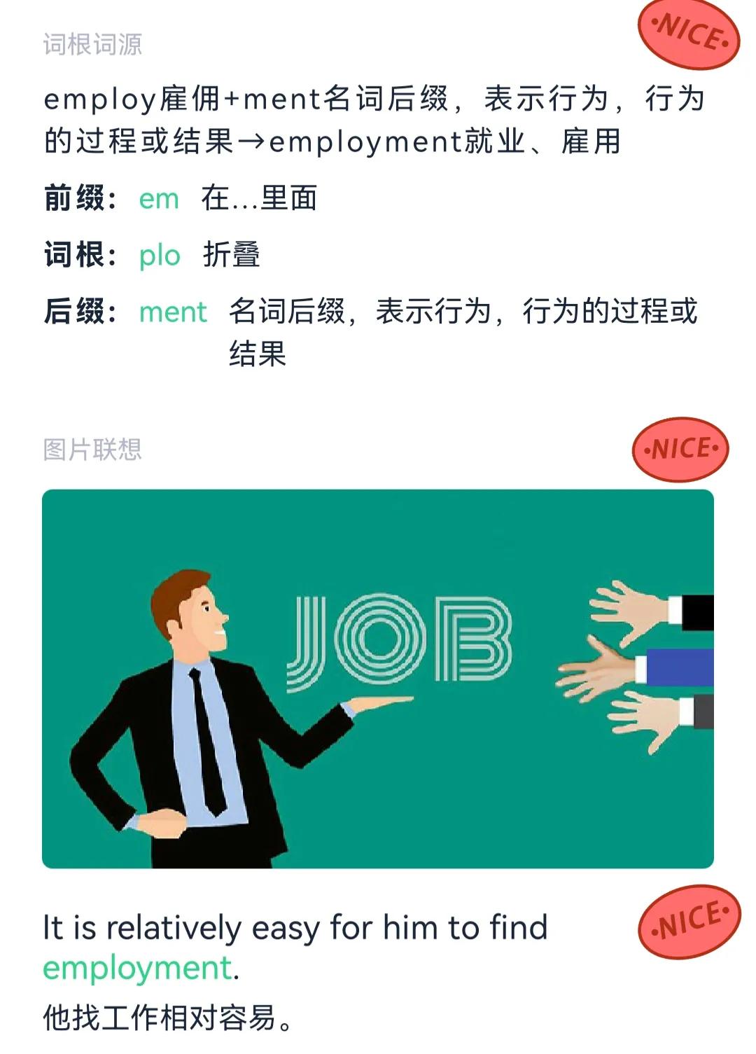 词根词源:employ雇员+ment名词后缀,表示行为,行为的过程或结果→employment就业、雇用