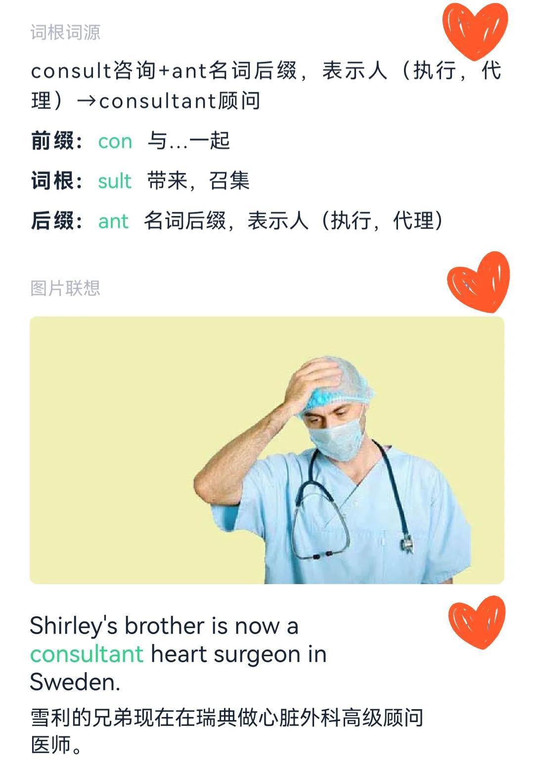 词根词源:consult咨询+ant名词后缀,表示人(执行,代理)→consultant顾问前缀:con与…一起 词根:sult带来 后缀:ant名词后缀,表示人(执行,代理)