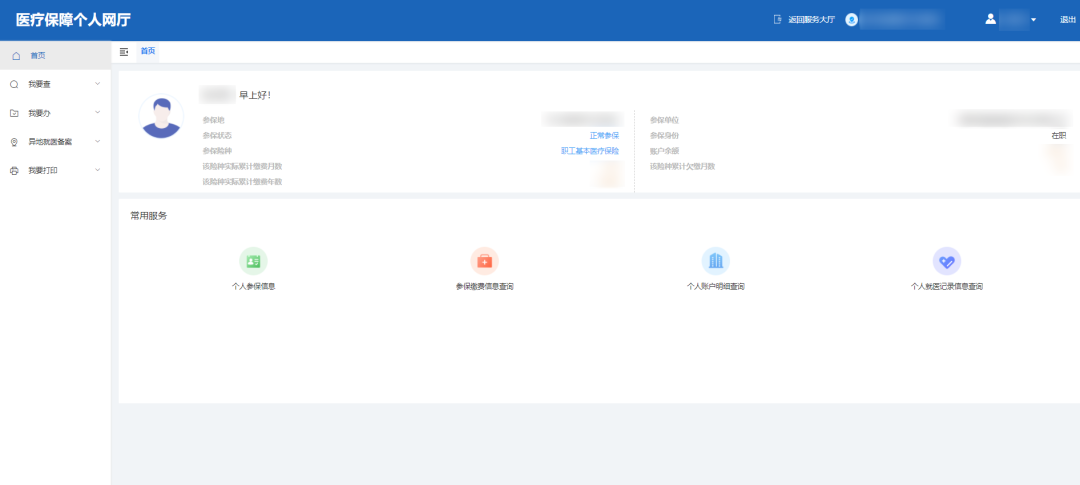05.进入个人网厅首页后,即可查看目前的参保信息,如:参保地、参保状态、参保险种、该险种实际累计缴费月数、该险种实际累计缴费年数、参保单位、参保身份、账户余额及该险种累计欠缴月数。