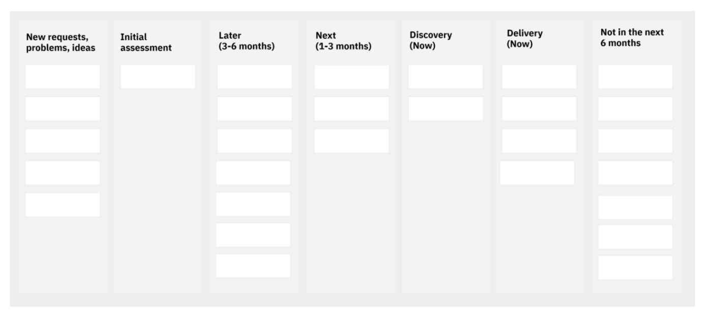 将 [Now] 分为【现在发现】和【现在交付】。在大多数路线图中,你会看到一个单独的 [Now] 专栏,混合了发现(研究、验证和概念工作)和交付(用户故事的敏捷实现)两个主题。发现和交付都应该是一个连续的过程,大多数产品经理都在同时研究这两个领域的主题。