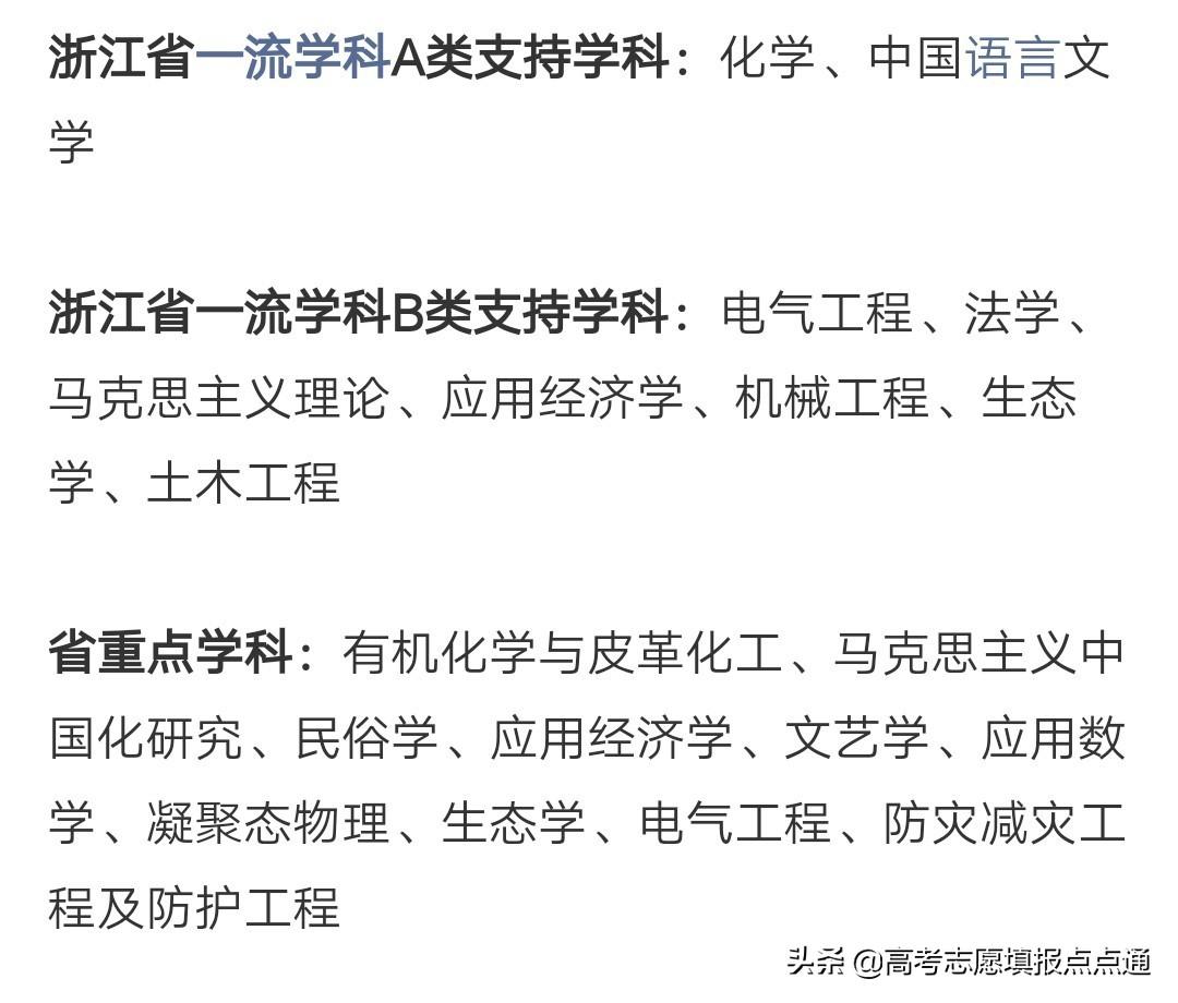 学校坚持“学科驱动”,着力培育优势特色学科,打造高峰高原学科,促进多学科交叉融合。2003年成为硕士学位授予单位,现拥有一级学科硕士学位授权点17个,硕士专业学位授权点12个。2017年被列为浙江省博士学位授予单位立项建设单位。生态学学科为浙江省重点建设的优势特色学科,化学、中国语言文学、电气工程、法学、马克思主义理论、应用经济学、机械工程、生态学、土木工程为浙江省一流学科,化学、材料科学、工程学3个学科进入ESI全球前1%。