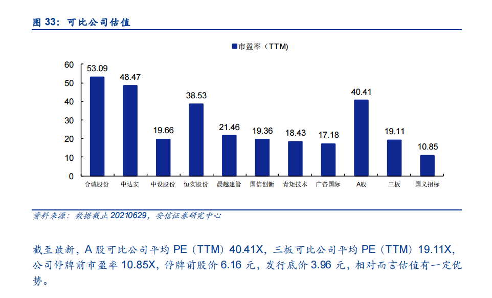 在营业收入方面,国义招标 2020 年营收为 2.13 亿元,在招标代理方面的营业收入高于其他 行业可比公司,具有较明显的规模优势。归母净利润方面,招标股份较高系其工程监理项目 贡献所致,国义招标 2019 年归母净利润 6.272.05 万元,在可比公司中处于行业上游水平。安信证券研报认为,“A 股可比公司平均 PE(TTM)40.41X,三板可比公司平均 PE(TTM)19.11X, 公司停牌前市盈率 10.85X,停牌前股价 6.16 元,发行底价 3.96 元,相对而言估值有一定优 势”。