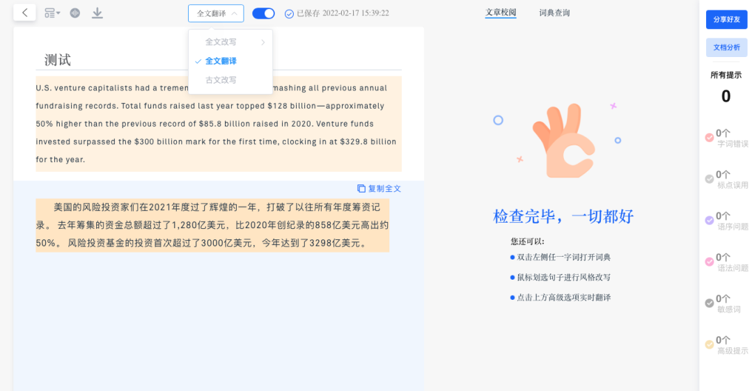 「写作猫」是一款文档自动化工具,主要提供包括错别字、标点错误、语病语法错误等常见文档纠错/改写功能,而且支持翻译功能,用户可以在一个界面同时实现文档审校和翻译。