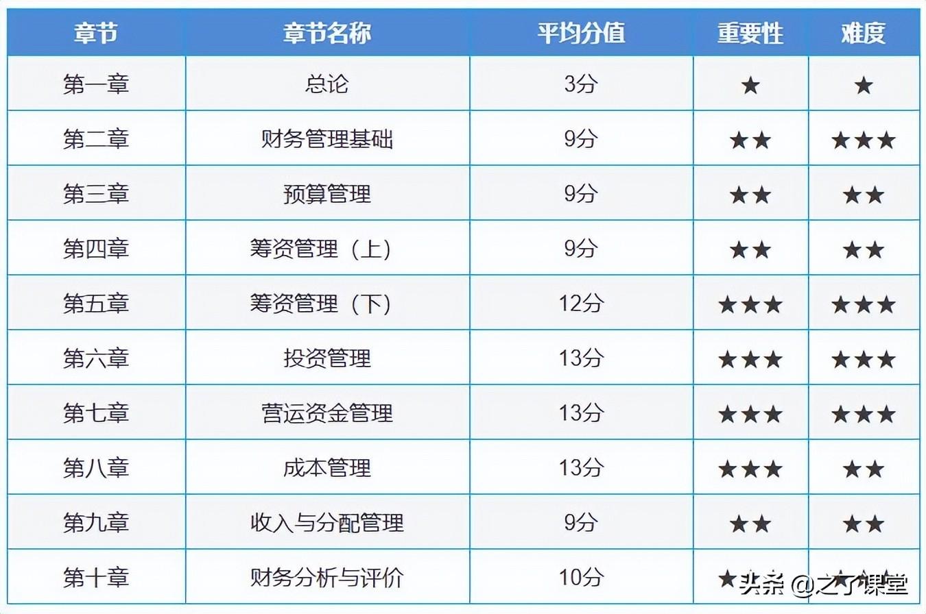 考察重点集中在:筹资管理、投资管理、营运资金管理、成本管理和财务分析和指标评价部分。