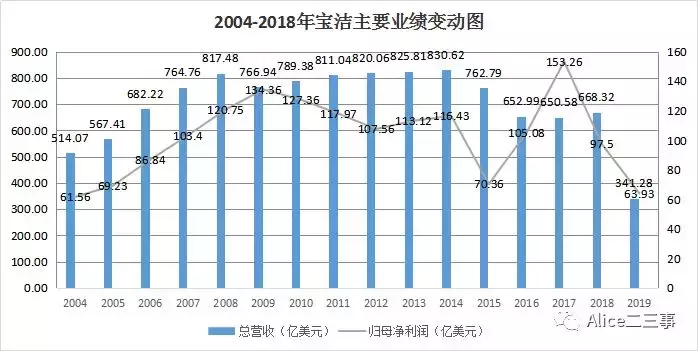 可看出宝洁2004财年至2019财年营收和净利润的变动情况。