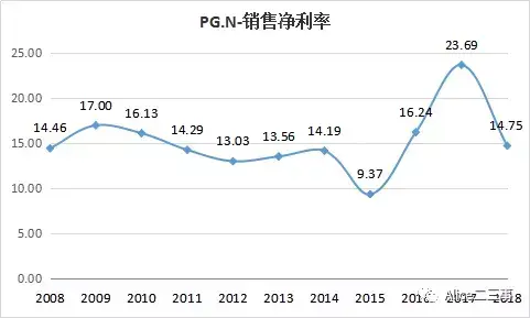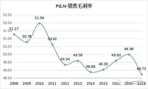 从2008财年到2018财年,宝洁的销售毛利率在数值上的波动并不太大,整体处在下降趋势。