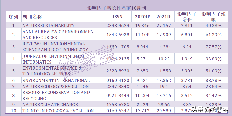 ENVIRONMENT/ECOLOGY环境生态学的381本期刊中,共有80本期刊影响因子增长超过1分,其中期刊NATURE SUSTAINABILITY影响因子从19.346增长至27.157,增长最高达7.811分;而期刊ISRAEL JOURNAL OF ECOLOGY & EVOLUTION影响因子涨幅最高,从0.559增长至1.463,涨幅高达161.72%。