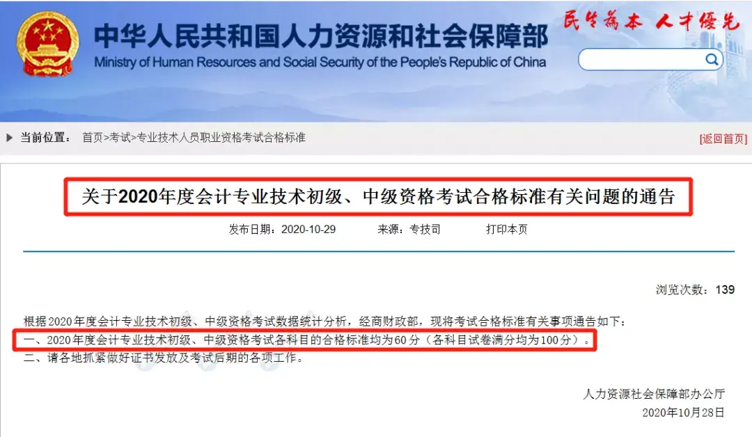 刚刚!人社部正式公布:2020年度会计专业技术初级、中级资格考试各科目的合格标准均为60分(各科目试卷满分均为100分)。