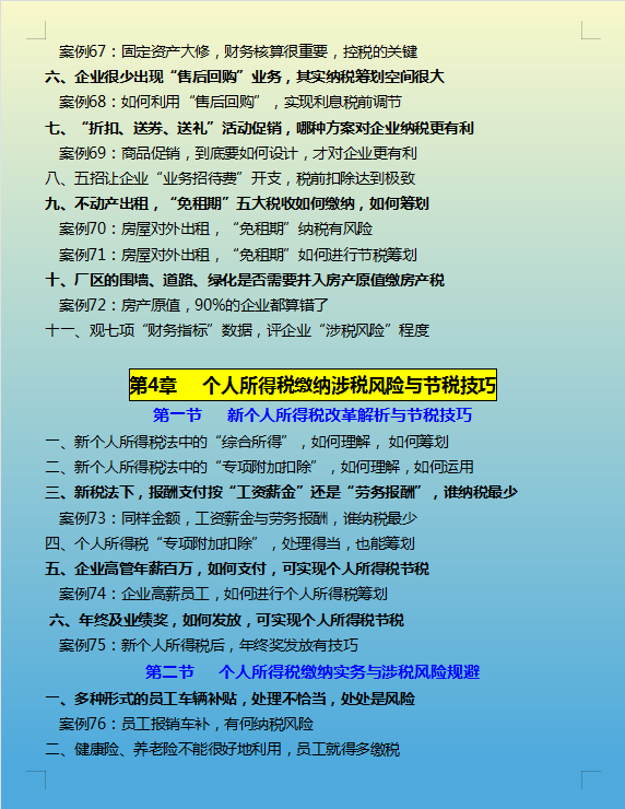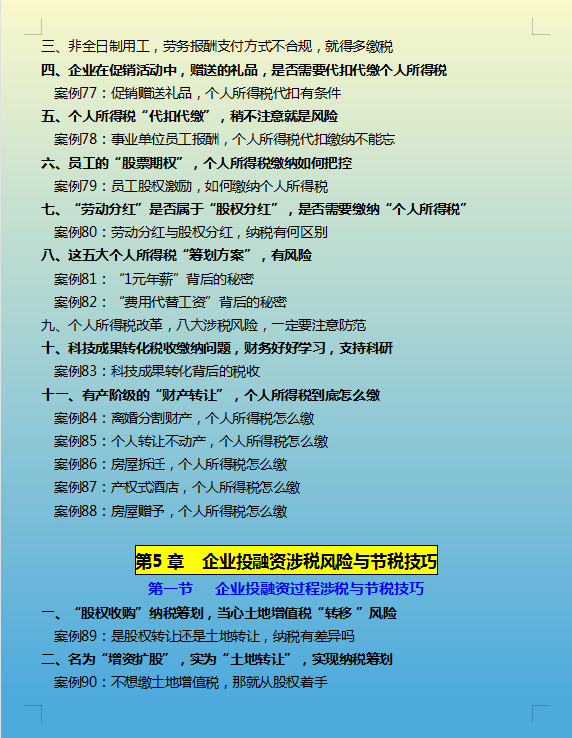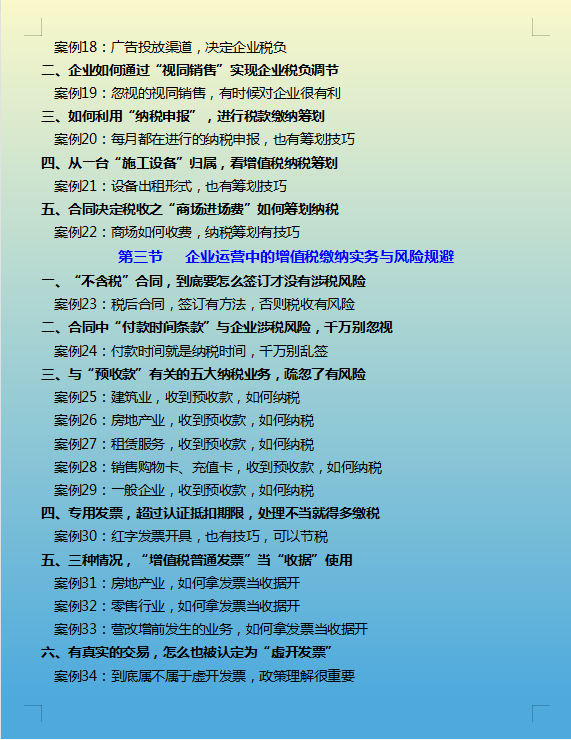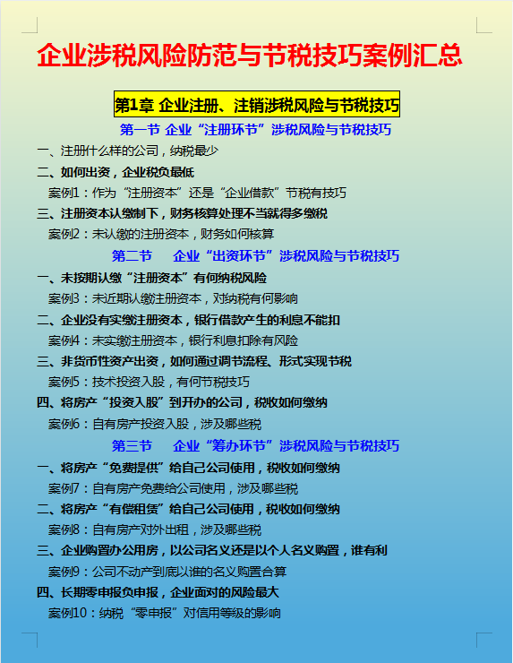 后来寻得财务总监的帮助,才慢慢步入正轨,今天给大家分享一套我们总监给我的企业涉税风险防范技巧与税务筹划案例汇总,真的是太干货了!一起来看看吧~