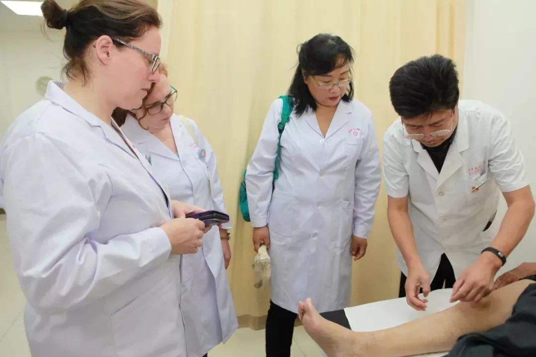 丽吉娜·施瓦尼茨教授(左一)正在给医生学员进行针灸