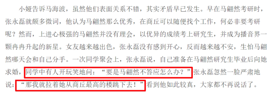 在马翩然读研期间,他表面上是对女友关爱有加,天天给马翩然打电话,实则对她产生了极大的不信任感,他要求马翩然每天都要报备行程,电话一接慢了或是没看到,就会大发脾气。