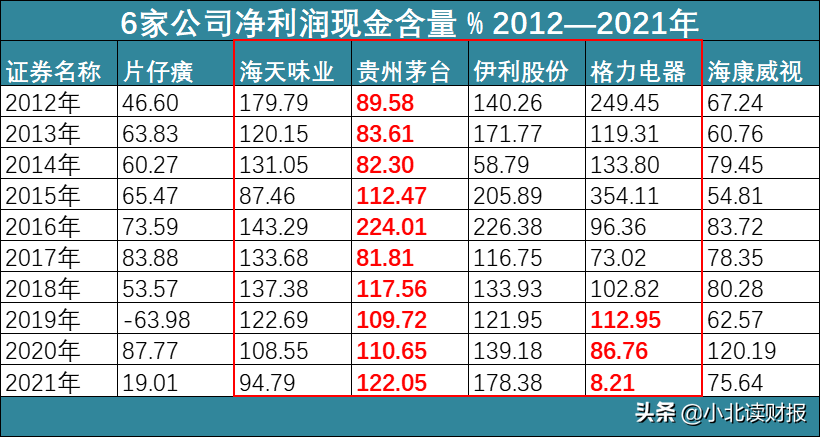 海天味业、伊利股份、贵州茅台和格力电器的净利润现金含量都很高,在格力电器强势的年份,其经营活动现金流量净额除以净利润的比值,能够达到3倍多。