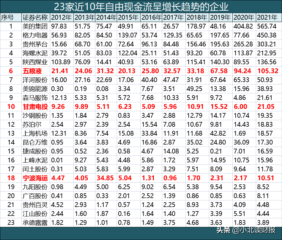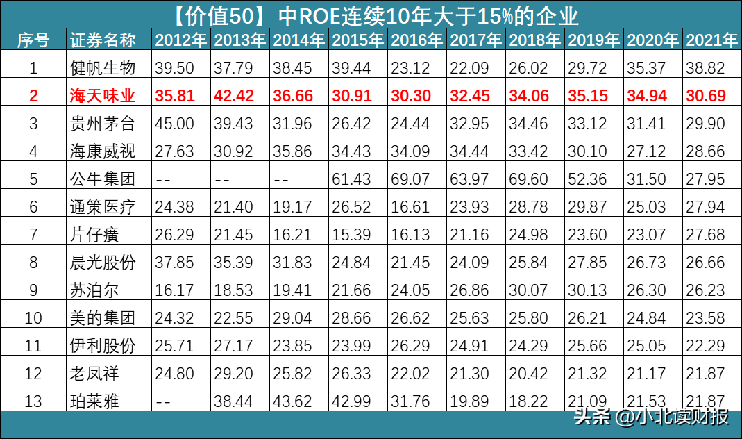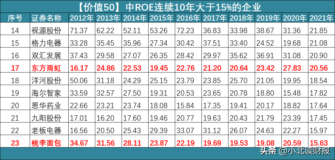 【价值50】里的50股票,如果再严格筛选标准,按照“2012—2021年净资产收益率大于15%”来排除企业的话,我们留下来的企业还不到一半,只剩下23家了。具体的企业名称如下图所示。