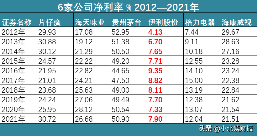 让我吃惊的是海天味业的净资产收益率竟然高于贵州茅台,过去10年里有7年是这样的情况。我一直以为茅台赚钱比海天容易多了,并且茅台走的是差异化高价格的路径,这跟海天味业大宗消费品的属性完全不同。