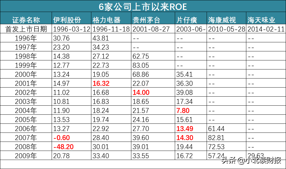 这6家公司的ROE基本在20%以上,其中片仔癀的净资产收益率呈现出稳步提升的趋势。近几年受疫情叠加其他因素的影响,海天味业、格力电器灯和伊利股份的ROE有所下滑。