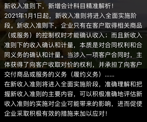版权声明:我们致力于保护作者版权,注重分享,被刊用文章【新会计准则应用(2021年最新收入准则下新增会计科目)】因无法核实真实出处,未能及时与作者取得联系,或有版权异议的,请联系管理员,我们会立即处理! 部分文章是来自自研大数据AI进行生成,内容摘自(百度百科,百度知道,头条百科,中国民法典,刑法,牛津词典,新华词典,汉语词典,国家院校,科普平台)等数据,内容仅供学习参考,不准确地方联系删除处理!;