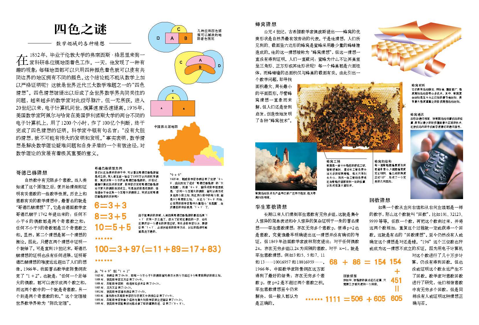 在1852 年,毕业于伦敦大学的弗南西斯·格思里来到一家科研单位搞地图着色工作。一天,他发现了一种有趣的现象:每幅地图都可以只用四种颜色着色就可以使有共同边界的地区拥有不同的颜色。这个结论能不能从数学上加以严格证明呢?这就是世界近代三大数学难题之一“四色猜想”。四色猜想被提出以后成了全世界数学界共同关注的问题,越来越多的数学家对此绞尽脑汁,但一无所获。进入20世纪以来,电子计算机问世,演算速度迅速提高。1976年,美国数学家阿佩尔与哈肯在美国伊利诺斯大学的两台不同的电子计算机上,用了1200 个小时,作了100 亿个判断,终于完成了四色猜想的证明。科学家牛顿有句名言:“没有大胆的猜想,就不可能有伟大的发明和发现。”事实表明,数学猜想是解决数学理论疑难问题和自身矛盾的一个有效途径,对数学理论的发展有着极其重要的意义。
