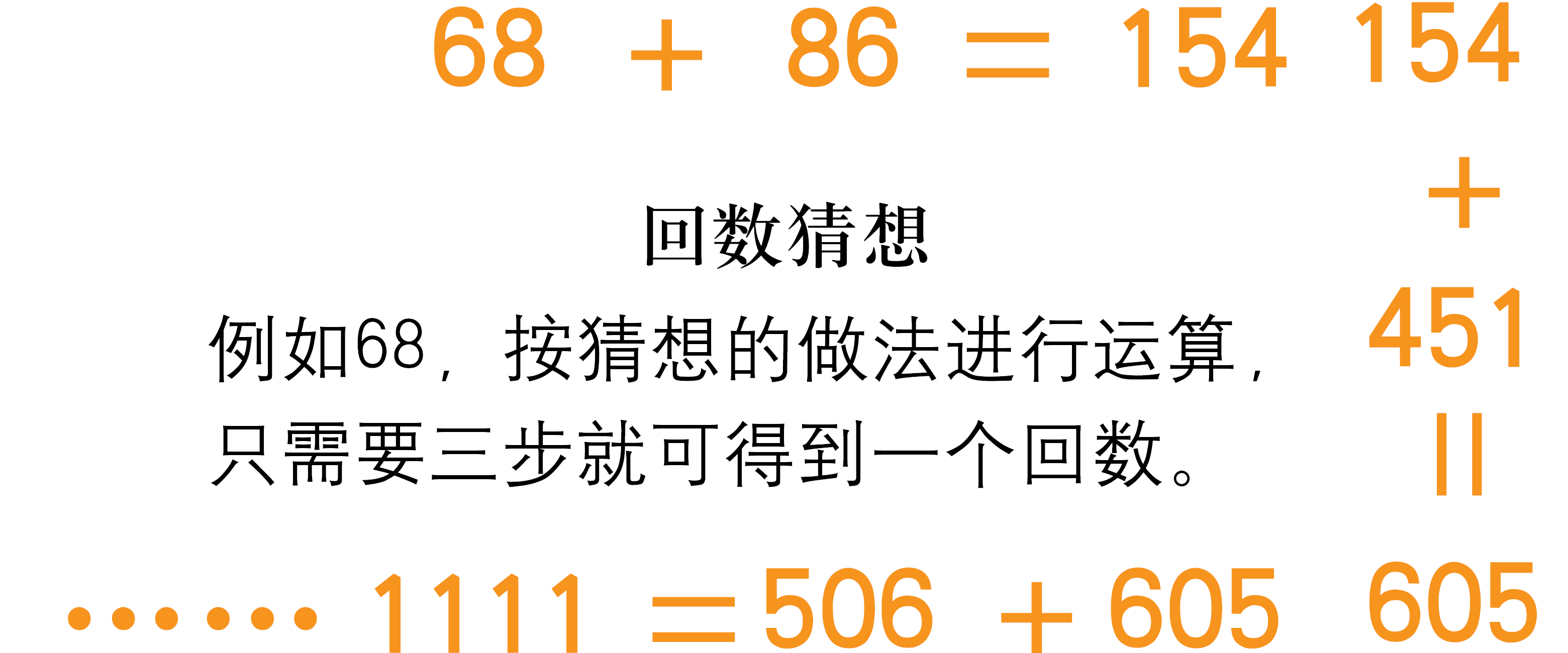 如果一个数从左向右读和从右向左读都是一样的数字,那么这个数就叫“回数”,比如101、32123、9999 等等。任取一个数,再把这个数倒过来,并将这两个数相加,重复这个过程就一定能获得一个回数。这就是有名的“回数猜想”。至今仍然没有人能确定这个猜想是对还是错。“196”这个三位数也许能成为这一猜想不成立的反证。因为用电子计算机对这个数进行了几十万步计算,仍没有得到回数。但也没能证明这个数永远产生不了回数。数学家对素数回数进行了研究,他们相信素数中有无穷多个回数,但是同样没有人能证明这种猜想正确与否。