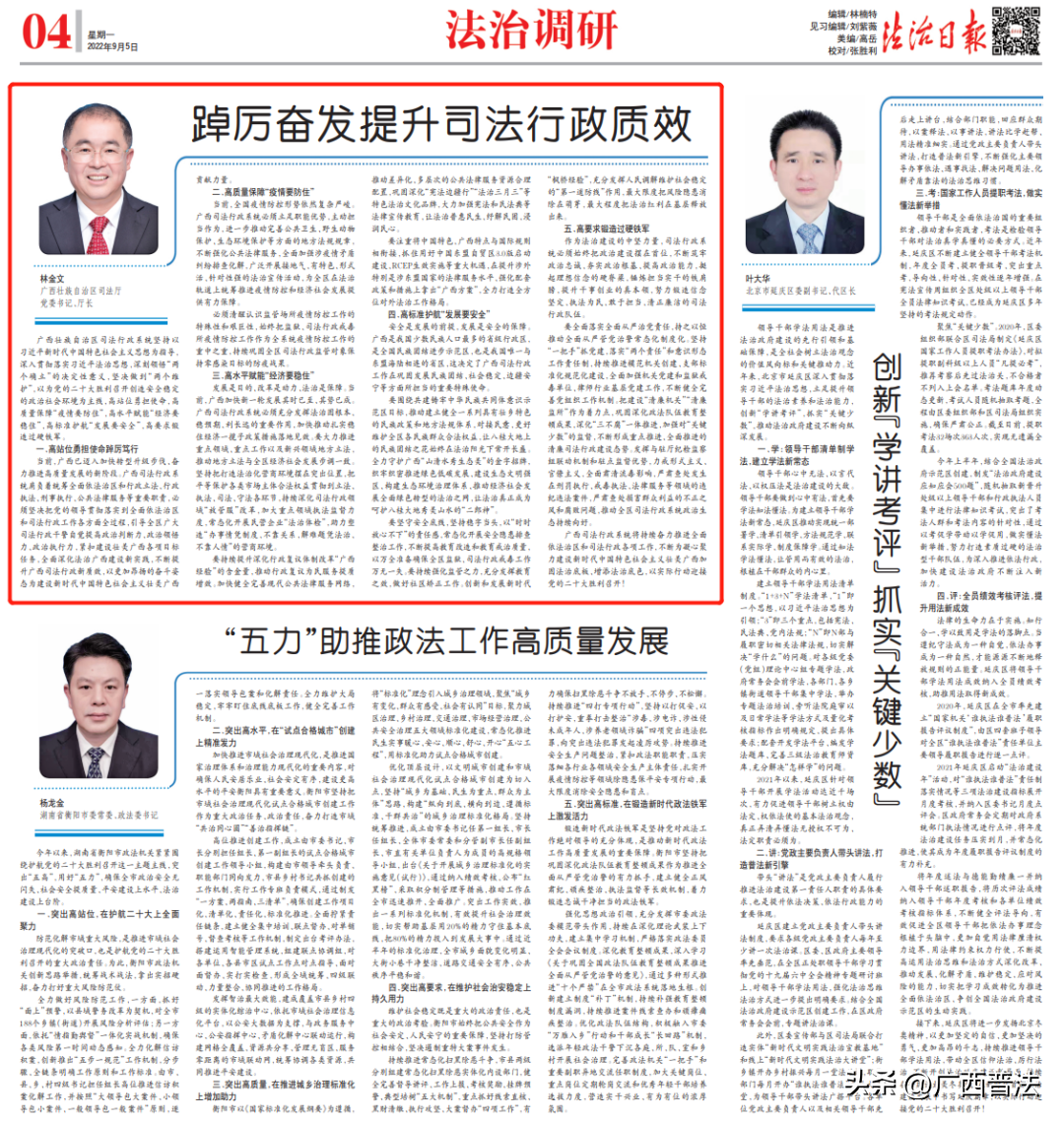 9月5日,《法治日报》刊发自治区司法厅党委书记、厅长林金文署名文章《踔厉奋发提升司法行政质效》。