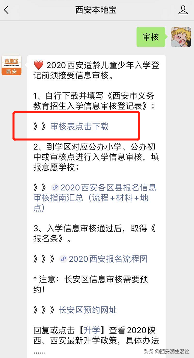 2020西安报名信息审核登记表,只提供网络下载渠道。西安本地宝对话框输入【审核】,即可进入登记表下载入口。