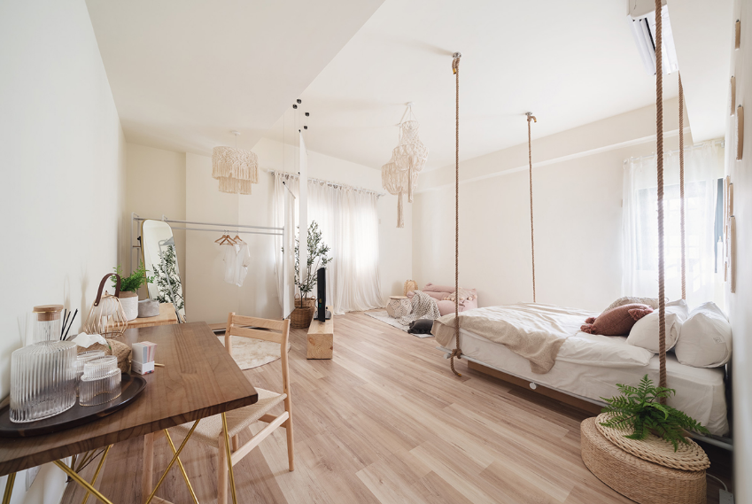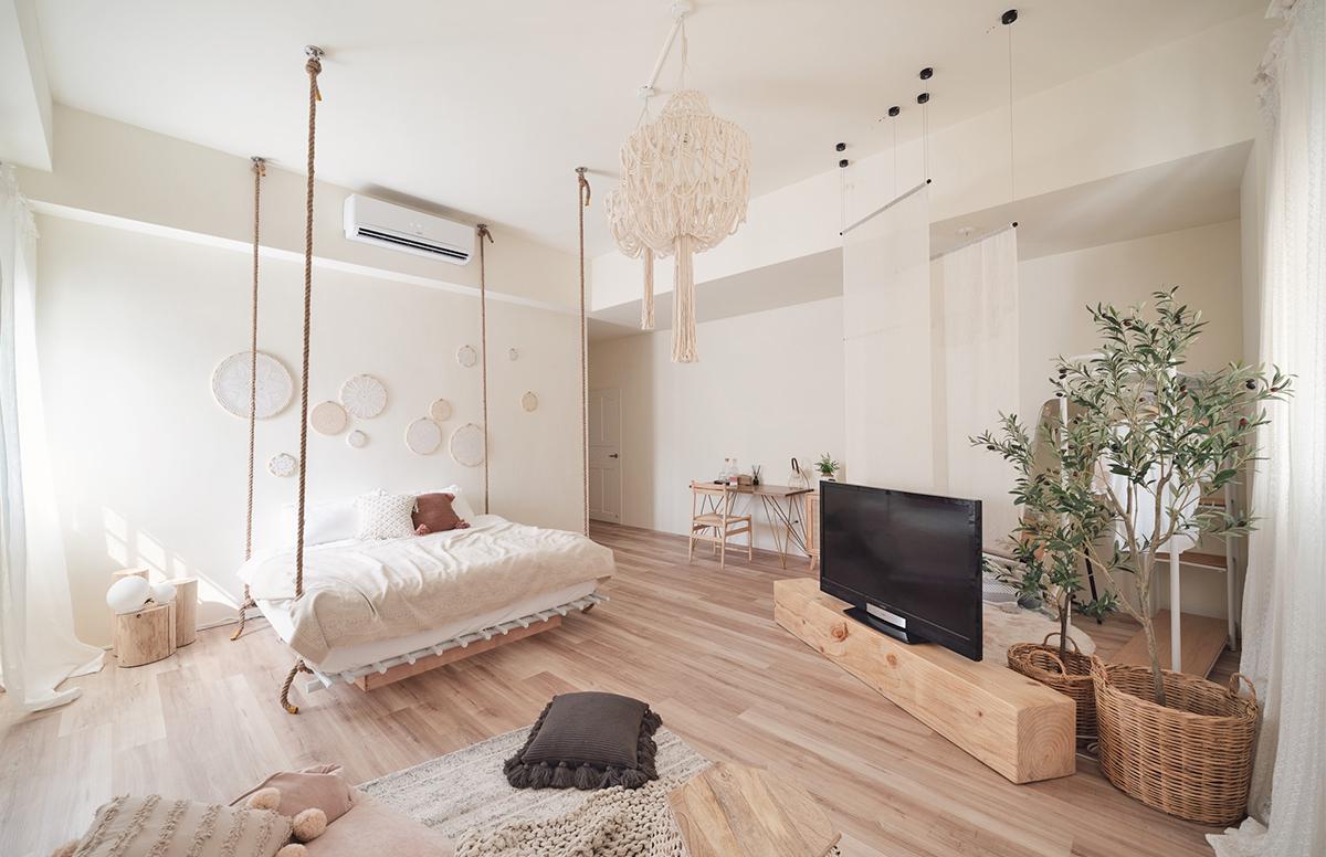 改造后的主卧,特意挑选漂浮式床组,独树一帜的睡眠体验。背景墙以圆竹框编织蕾丝图案装点浪漫氛围。