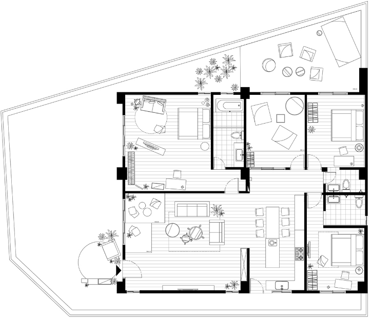 地面更换成木地板,并且局部做抬高设计,变成一方休闲空间,可以根据需求进行空间调整,空间非常有弹性。