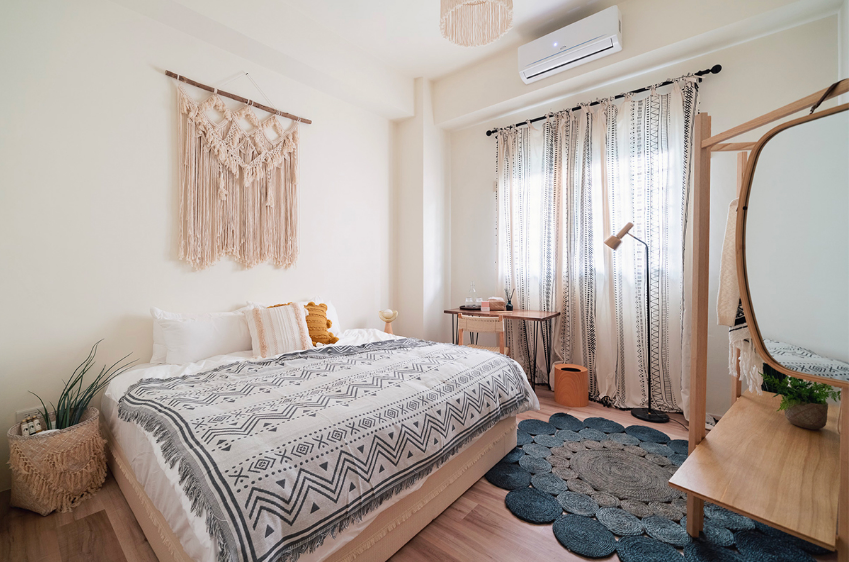 天花主灯、墙上工艺品、盖毯、地垫、窗帘、床头柜到储物篮,无一不透露着自然轻松感。