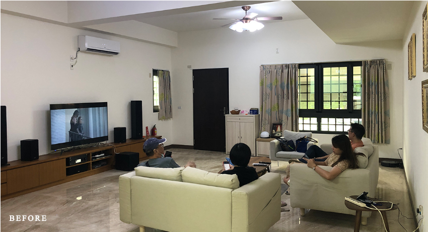 原有多功能房,给人感觉依旧很深沉,而且框架式的窗户,加上低矮的窗帘设计,有种牢笼的感觉。