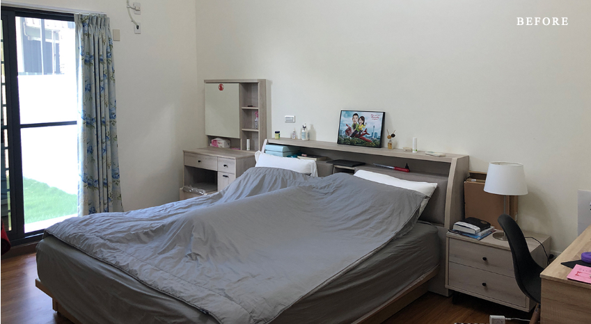 改造后的效果,调整了床的摆放位置,拥有更好的空间体验。从墙面到地面,都进行了一次全新改造。