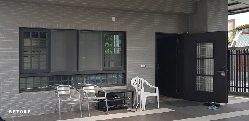 改造前的户外玄关,墙面颜色过于厚重,无法串接改造后的室内风格,并且缺少收纳和相应的照明设计。