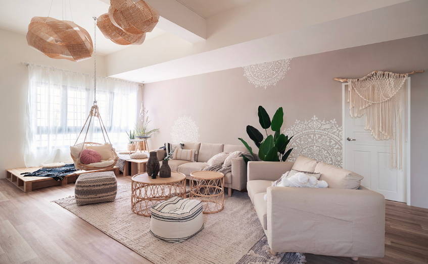 改造后的客厅,以北欧度假风为主轴,奶茶色的沙发和墙面,保持视觉上的统一。墙面透过白色蕾丝图案点缀,给空间带来几分清新舒适。