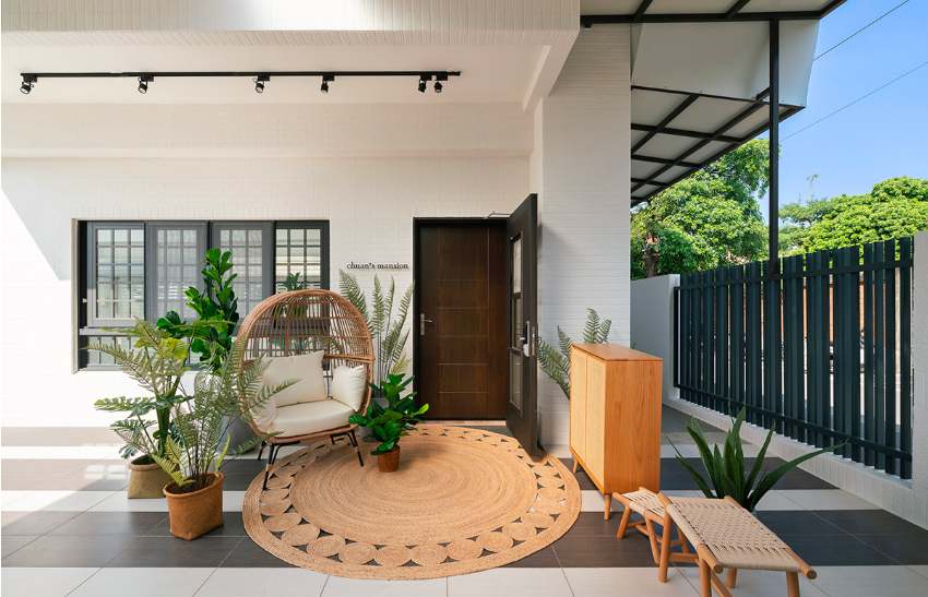 改造后的户外玄关,将墙面做刷白处理,改善原有视觉厚重感。搬离老气过时的家具,利用藤编元素和木质家具引领空间,地垫的铺设衍生出质朴韵味。前后对比,差距很明显。