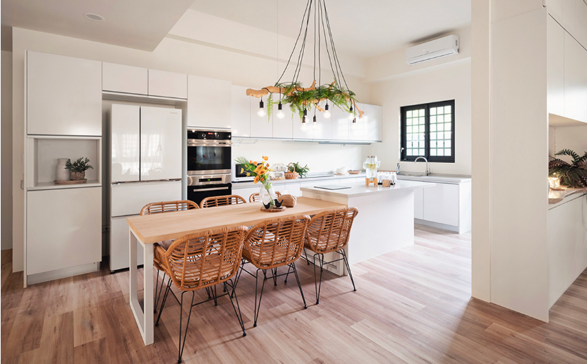 将原有餐桌改造成温润的原木色,搭配上藤编椅子,以及自然感十足的绿植款组合吊灯,营造出非常自然惬意的用餐氛围。