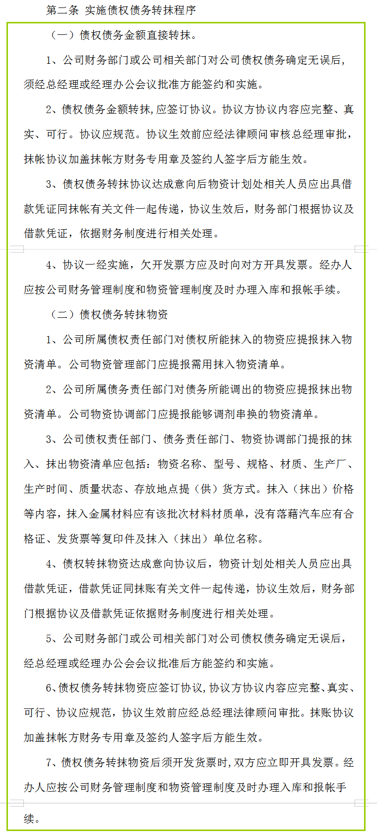 规范债权,债务清理转抹帐行为。对公司资产保值,活化流动资金,保证生产。公司各相关业务主管部门对公司债权债务金额实施转抹,利用公司债权债务转抹物资。