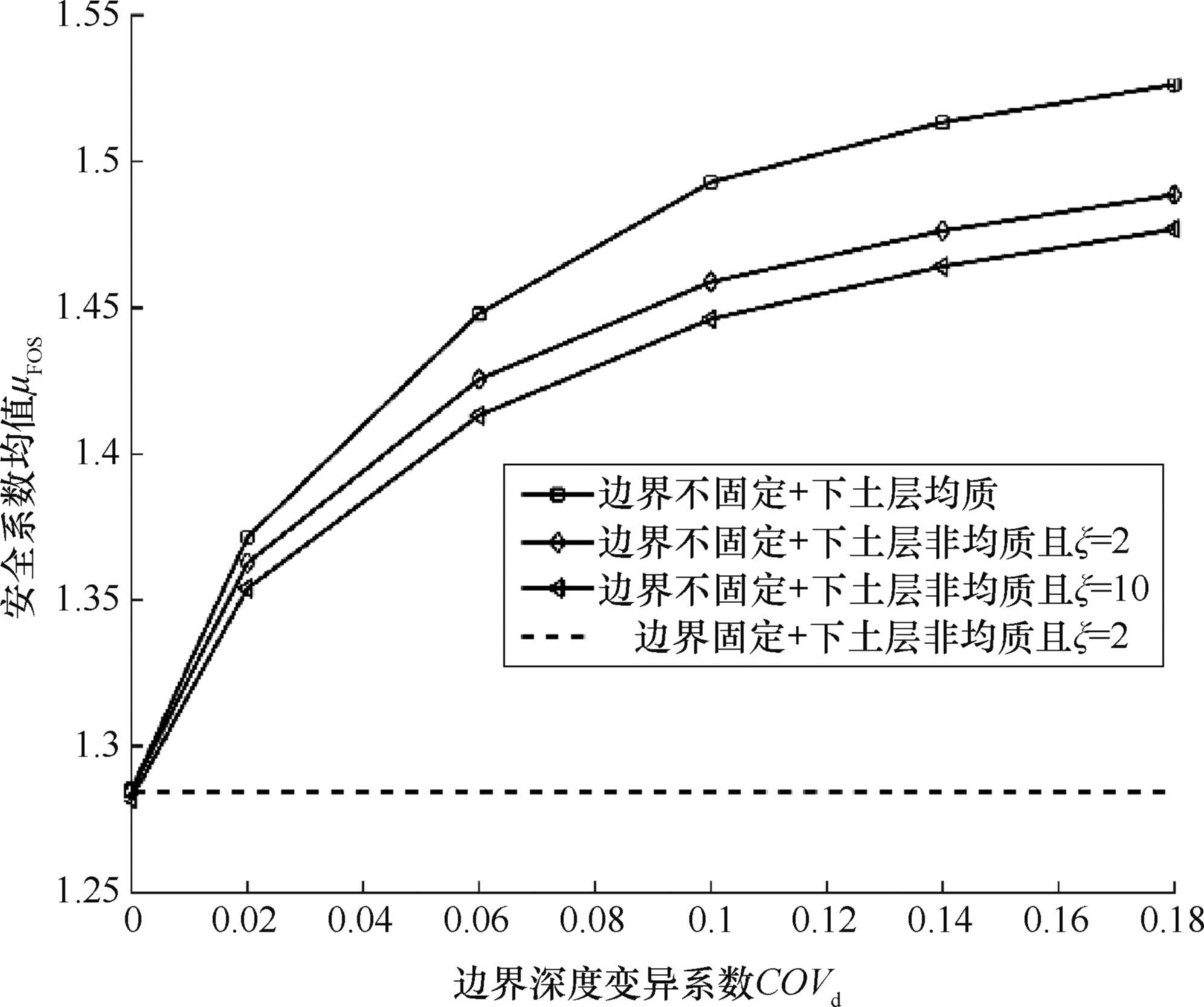 如图6所示,就FOS均值来看,三种条件下当COV 取0(即边界固定),μ 在1.28徘徊。COV 增大时,μ 都 大,当COV 取0.18时,μ 均已经超过了1.45。而边界确定情况下,无论是否考虑下土层空间变异性,μ 都在 徊。可见边界深度变异系数对边坡整体安全性有明显影响,特别是大大提高了均质土的安全系数均值,但与土体 间变异性的耦合作用并不显著。